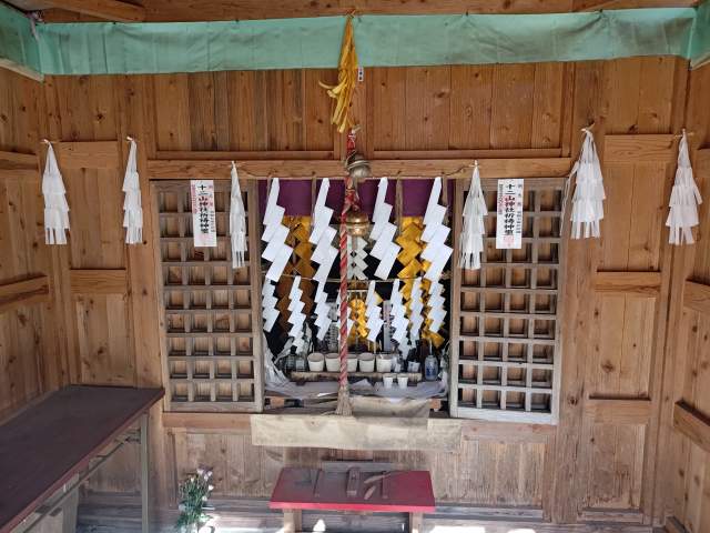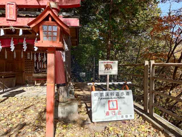 駐車場をでて川の右岸側(川の上流に向かって左側)にも遊歩道があるようなのですが、最近は熊が出没した様で通行止めになっていました仕方ありません。通行止めの看板のすぐわきに十二山神社の祠がありましたので旅の安全をお祈りしました。