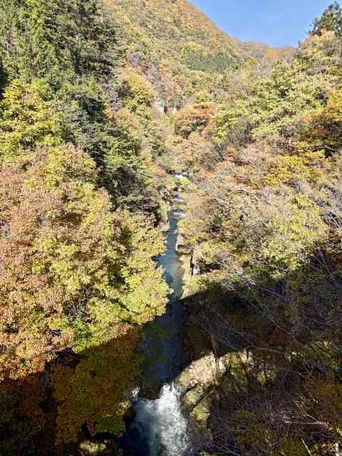 途中お土産物屋さんのあたりはまだそれほどではないですが、しばらくすると結構な階段を下ります。渓谷の紅葉は最盛期には少し早かったのですが沢山の観光客が訪れていました。