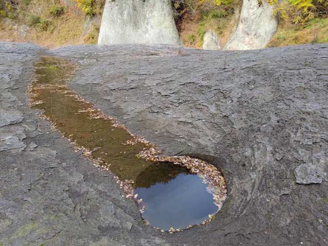 遊歩道の途中に面白い場所がありました。水の流れで石が回転してえぐった穴です。以前、福島県の湯岐温泉近くにあった「河童のすり鉢」を思い出しました。これだけの穴をあけるにはどれほどの時間がかかったのか想像することもできませんね。