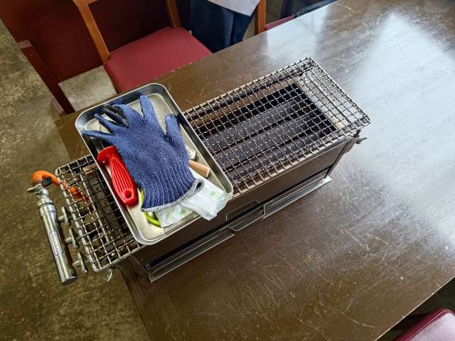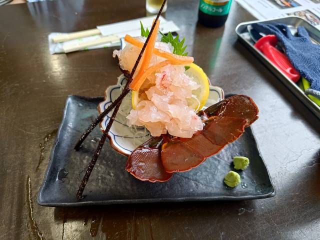 席にはガス台が置かれていて軍手やハサミなどの道具がセット。さあ海老が来るのが楽しみ。ああ、それから「地だこ」のお刺身も頼みましょうか。しばらくすると伊勢海老が来ました。早速焼いていきましょう。