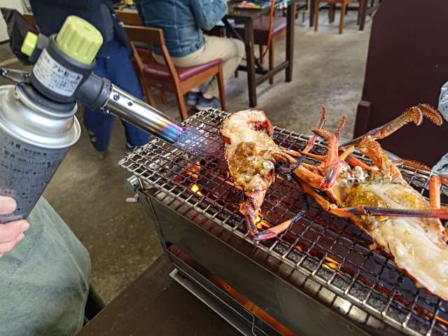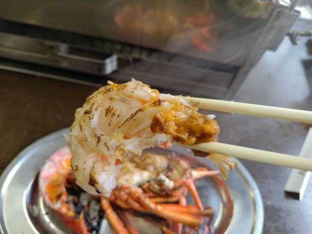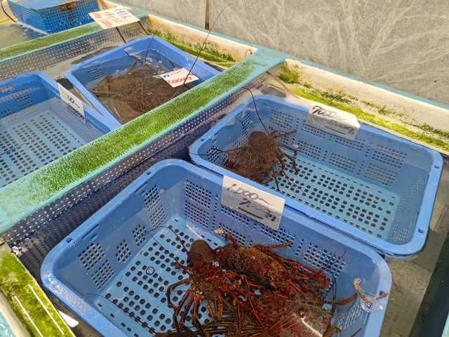 開店と同時にお店の中へ。席に案内していただいたら、早速お目当ての「伊勢海老」を選びに行きます。生簀には大小の伊勢海老が籠の中に分けられていて大まかな値札が付いていて、好みで選んで目方を計り値段が決まります。大きいのを一つか小ぶりなものを沢山など選び方は色々ですね。今回は程ほどの大きさのものを2尾選んで、浜焼きとお刺身にしてみます。