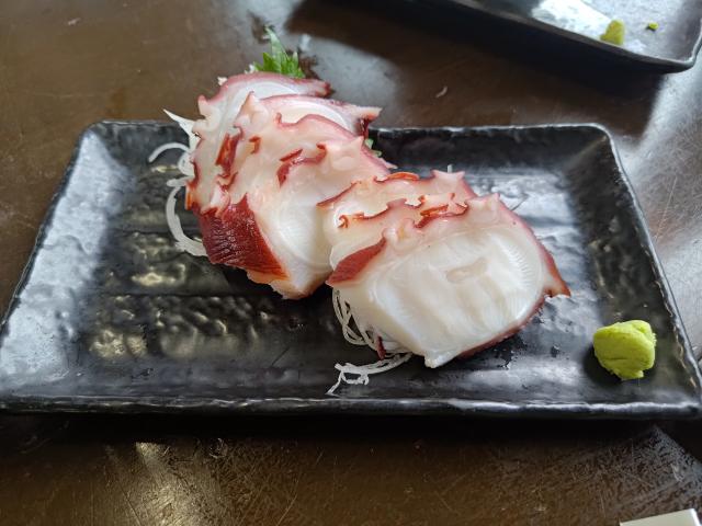 ちょっと残酷なようですが、踊るのは新鮮な証です。地だこのお刺身をいただいて焼けるのを待ちましょう。こちらも噛めば噛むほど味が出ますね。タコもおいしいものを食べて育ったに違いありません。ビールもいただきます。