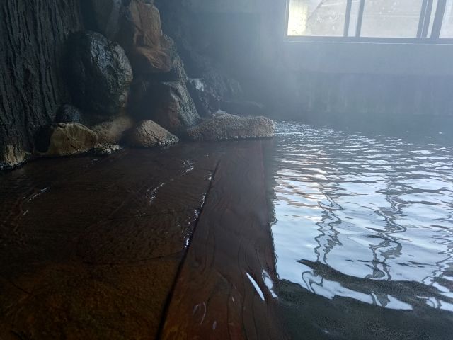 ああ、いいお湯ですね。浴感では43~44℃くらいでしょうか?。源泉が投入されているところをすくって味を見ると、うっすらと塩味がして温泉の香りがとてもいいお湯です。オーバーフローがとても多いのでトド寝もできますよ。
