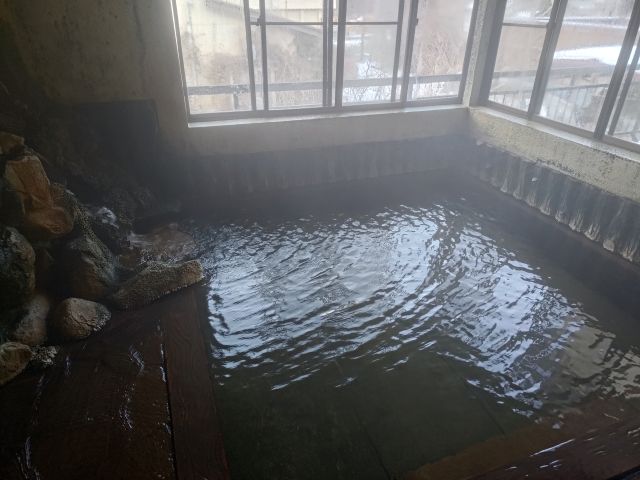 露天風呂は2015年に増築されたので一度玄関から外へ出て別棟へ向かいます。なるほど一段低い場所に建っているんで雪があると足元はよくないですね。男湯は解放感抜群なので女性が前を通ると丸見えです。まあ、混浴ではないのであまり気になりません。こちらの浴槽はドバドバではなく、程よい源泉投入量でお湯の温度もそれほど高くありません。長湯ができる温度です。