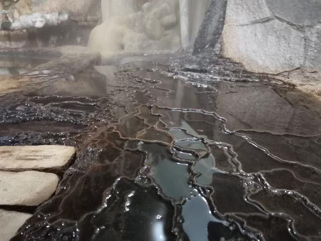 面白いのは、黒湯の浴室の奥にあるプール風呂。同じ敷地から湧出している源泉なのですが、黒湯ほど癖がなく、色も透明に近くて、いつまでも入っていられるお湯です。しかし成分は濃いようで、手すりについた猿の腰掛状の湧出物を見るとわかります。